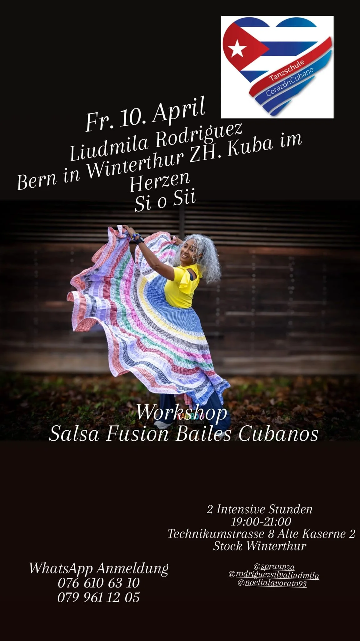 News Laufend Samstags-Angebot – Afrokubanische Tänze – Tecnica, Toques und Geschichten. Laufend Samstags-Angebot – Afrokubanische Tänze – Tecnica y Bailes YorubaInfos unter der Rubrik Kurse Samstags-Angebot Jeweils am Samstag 2026: Januar Workshops bei Resodanse Station – NeuchatelEstilo Chica, Son und mehr…www.resodanse-station.ch24.1 / 21.2 / 21.3 / 9.5 / 20.6 Specials Afrokubanische Workshop in Zürich 2026, Samstags: Basilea Salsa Club, presents, Afrokubanische und Son Workshop in Basel 2026, Samstags: Blues Dance in Bern 2026 Kellersaal GZ Bucheggstr. 93, 8057 Zürich, 10:30 – 11:55 Theorie, Gesänge, Basisschrite 12:00 – 13:30 Tanz intensiv.Beide Lektionen CHF 80.– / einzeln CHF 45.– Anmeldung bei Leonor +41 76 338 40 24 Liudanza-aché in Winterthur ZH. 2026 Tanzschule - CorazónCubano Afro- Pfingsten Festival, 20-25 May 2026 Winterthur www.basileasalsaclub.ch Freitag, 10.4. Workshop Salsa Fusion, Bailes CubanosWhatsApp Anmeldung: 076 610 63 10 / 079 961 12 05 Workshop 23.5.202615.00 - 15.55 Theorie & Basisbewegung, 16.00 - 17.25 intensiv Tanz Gruppe Achè Tour und Shows Dates 2026 30.5. Afrokubanische Workshop mit Liudmila & Ruth mit Live Perkussion.Infos und Anmeldungen an Bijiinfo@be-bluesed.ch 7.3. La Noche de Cuba Zürich - Show, Obatalá6.7. Fuego Latino, Fribourg - Schow, Rumbachán.15.8. Tag der Traditionen- Fribourg, Show- Obatala, Afrekete, Rumbachán.13.9 Bungalow- Biel, Show Rumbachán.